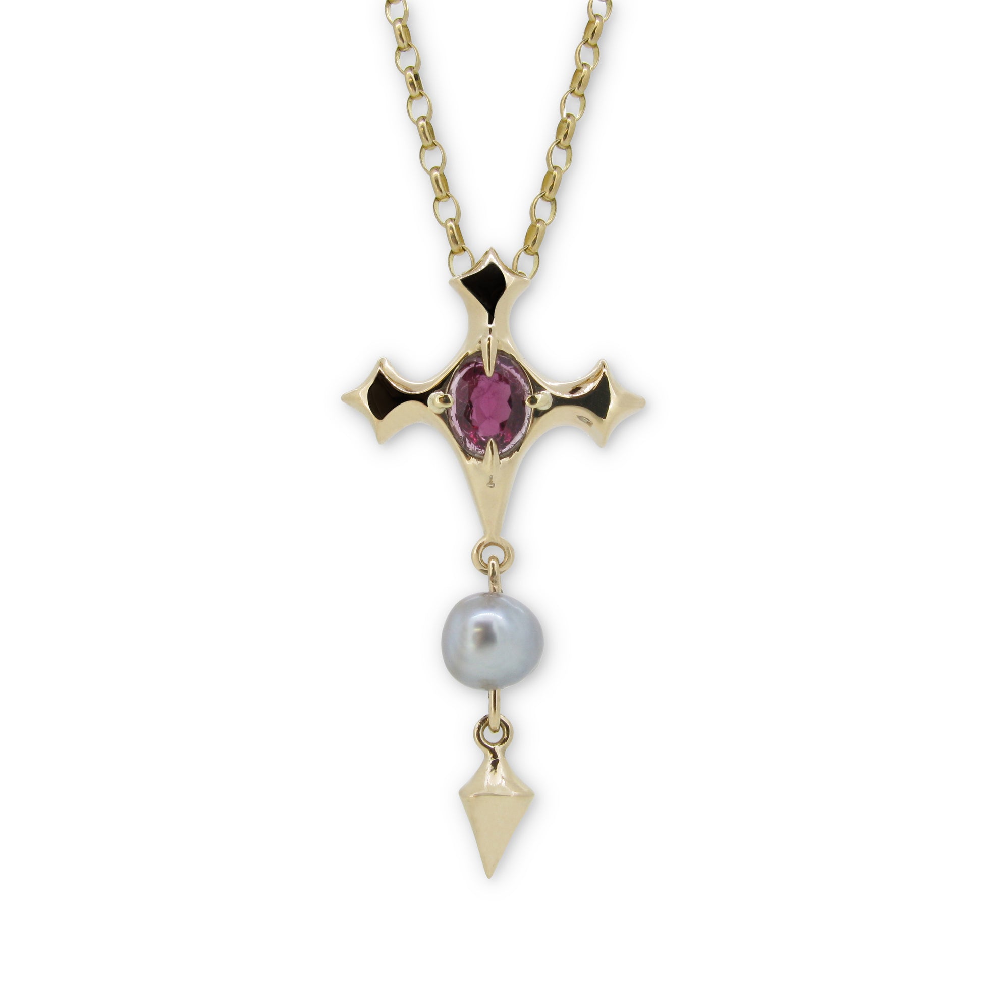 Baroque Pendant with Pink Tourmaline and Silver Tahitian Pearl in 9ct Ina Gold