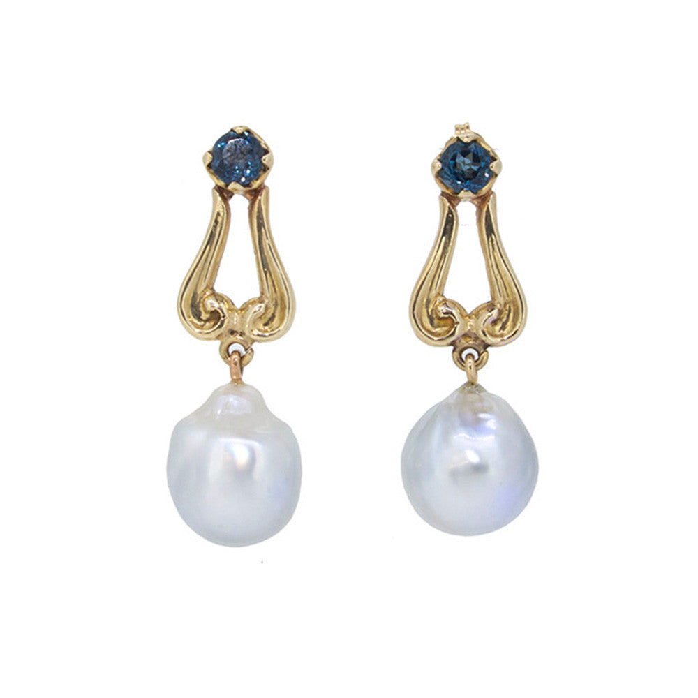 Curleque Earrings with London Blue Topaz and Tahitian Keshi Pearl in 9ct Gold