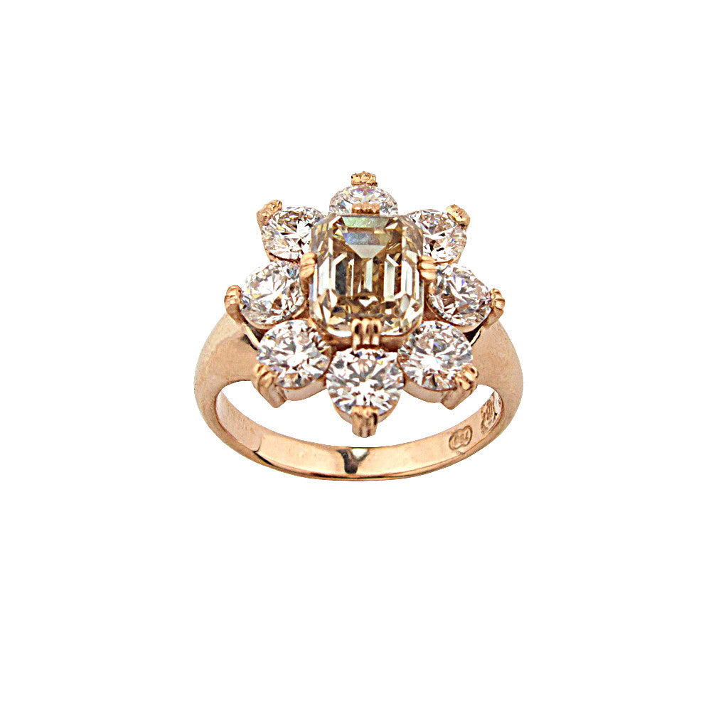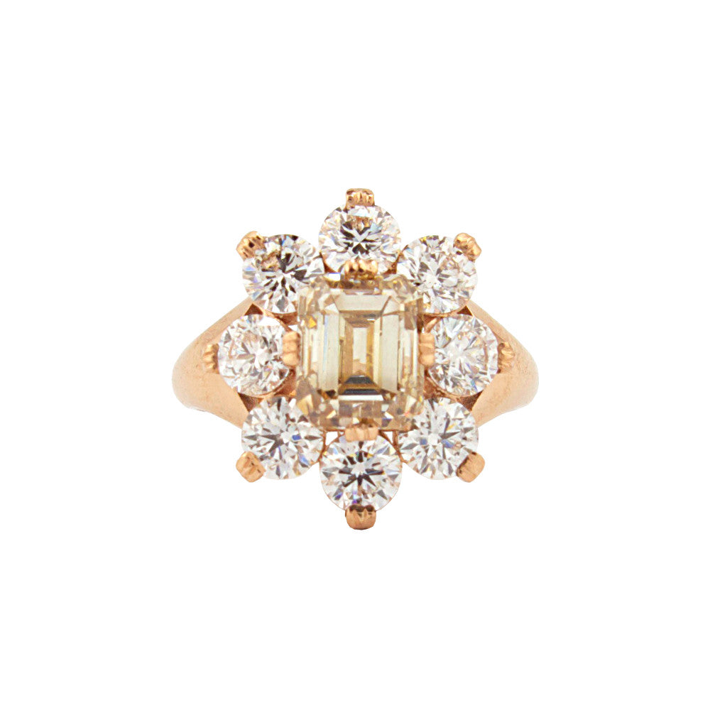 The central emerald cut champagne diamond is 2.4ct, the 8 surrounding brilliant cuts are 30pts each, set in 18ct rose gold.