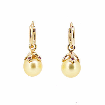 Majesty Pearl Drops with Gold South Sea Pearls and Rubies in 9ct Ina Gold