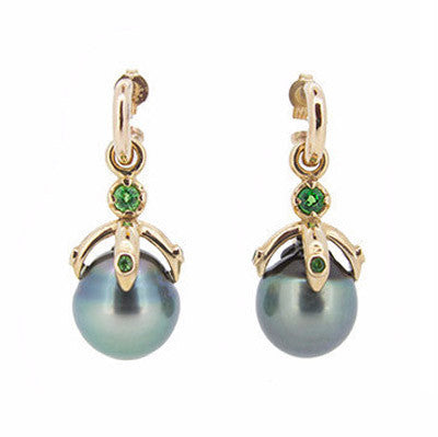 Orb Earring Drop Pair with Tahitian Pearls and Green Tsavorite Garnet in 9ct Gold
