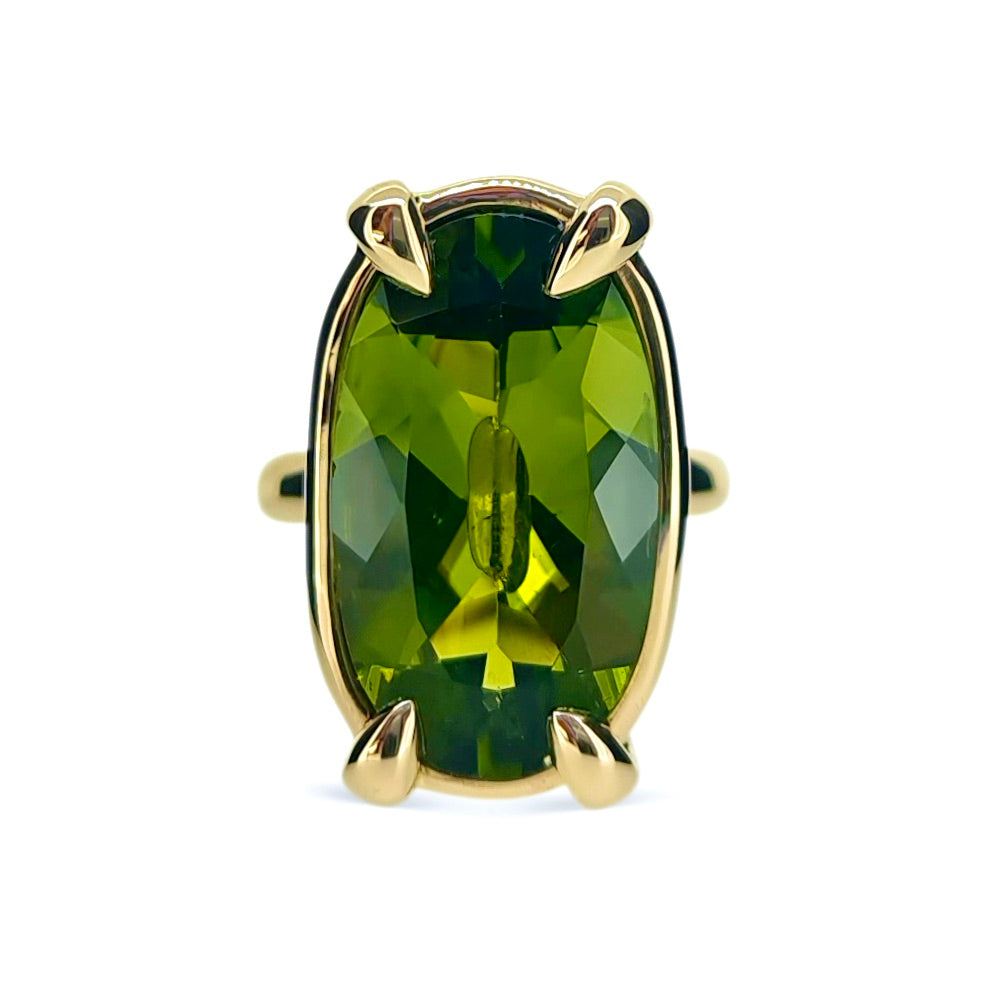 The Rock Ring; This exquisite and elegant piece makes a statement. Adorn your hand with this deep green Peridot in 9ct Ina Gold. This stunning ring features an oval, green Peridot surrounded by a strong contemporary gold band for a luxurious, sophisticated look. An artful design that exudes exclusivity, this piece is perfect for any occasion.