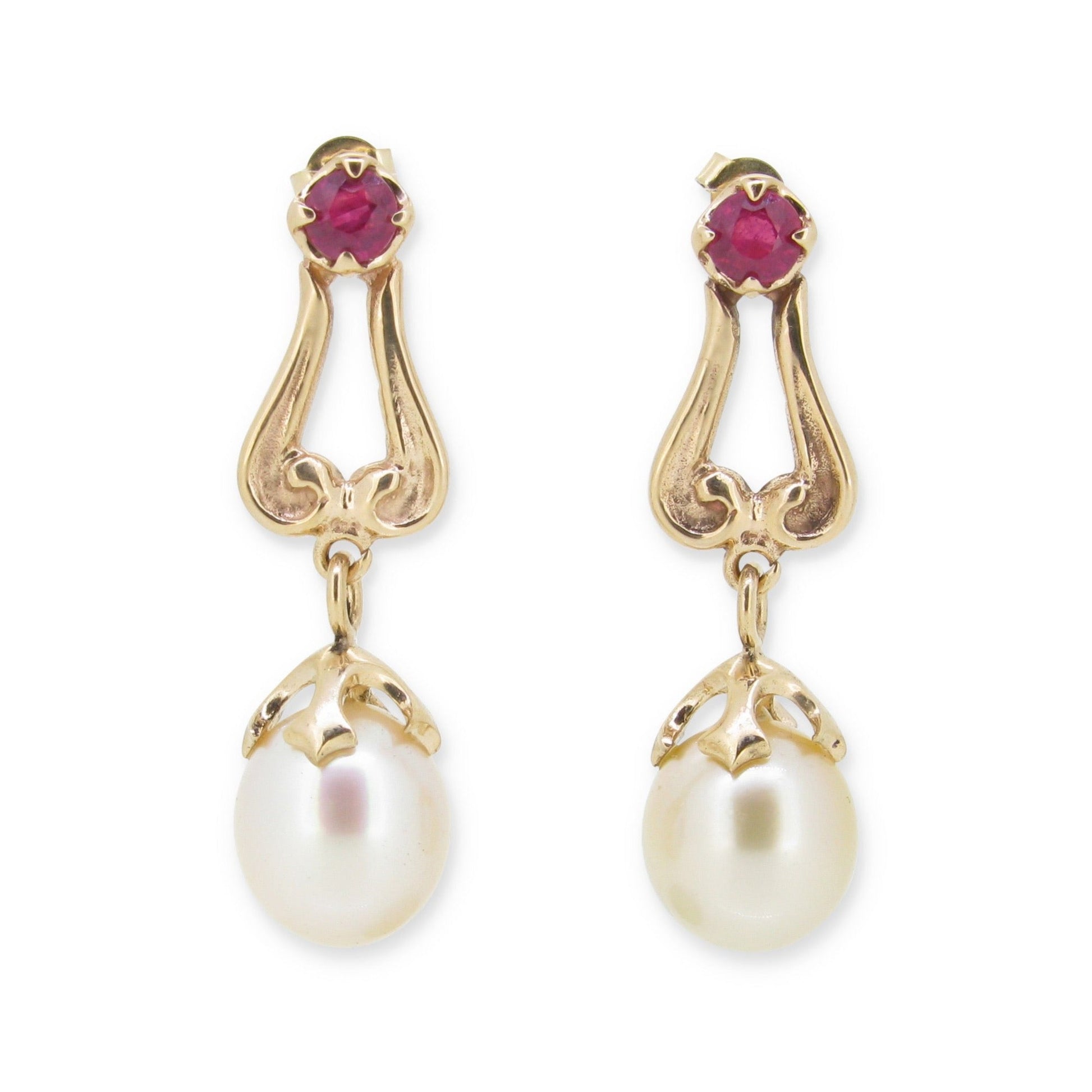 Elegant drop stud earrings set with 5mm filled Madagascan Rubies and 11mm cream South Sea Pearls.
